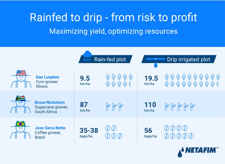 Let’s take for example three farmers in the U.S corn belt who converted some of their corn fields from rainfed to drip irrigationDan Luepkes from Illinois used drip successfully to irrigate some of his worst quality lands and was able to maximize income on every hectare. His corn yield grew from 9.5ton/ha on the rain-fed plot to 19.5ton/ha on the drip-irrigated plot. In North Carolina, Kevin Matthews went from 9ton/ha (on a rain-fed plot) to 19ton/ha (on a drip-irrigated plot) and said he “…doubled the yield, but only had to seed one time.” Kelly Garret from Iowa also started using drip irrigation in 2016. He summarized the experience by saying that “You don’t need to buy more land, you don’t need to buy more seeds. Worst-case scenario, you need another truck to haul away the bushels, that’s a wonderful problem!”