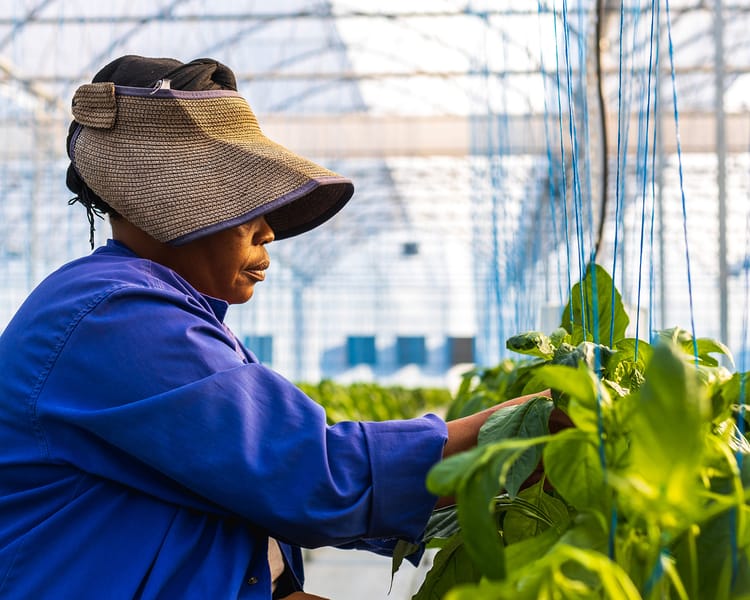 Rows of plants in Emseni greenhouse Worker in greenhouse Emseni greenhouse
